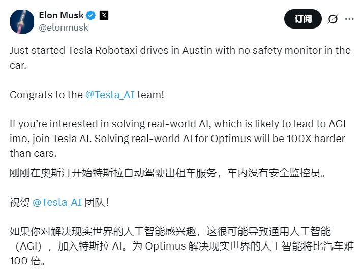 马哥本人宣布了这一里程碑时刻——特斯拉Robotaxi,开始启动全无人服务。