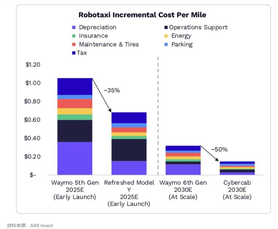 ARK Invest最近发布了一份报告,预测到2030年,Cybercab的成本大约是Waymo第六代Robotaxi的一半,总成本约为每英里0.4美元(约1.73元/公里)。