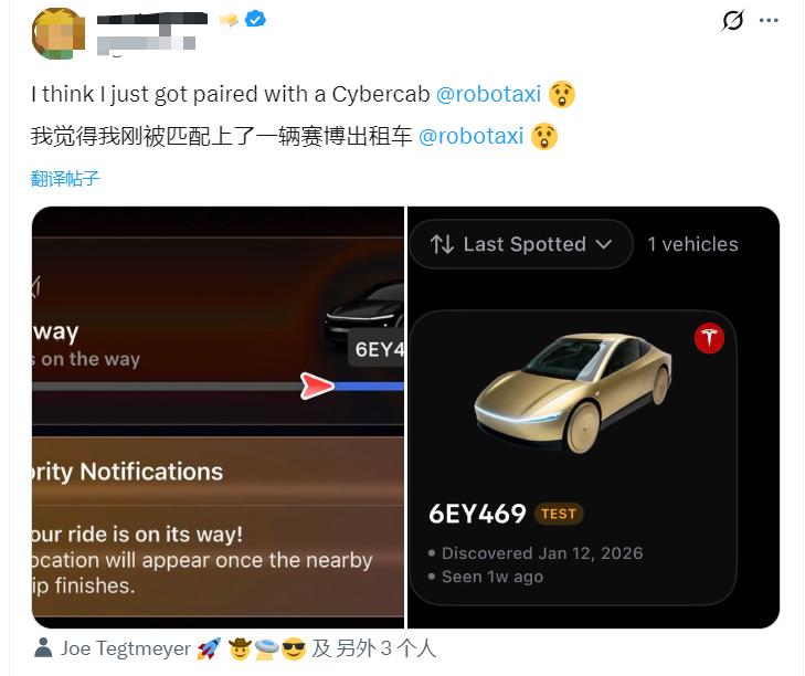 另一位网友也尝试呼叫了一辆特斯拉Robotaxi,而且看起来信息量更大——屏幕里出现的是一辆Cybercab。