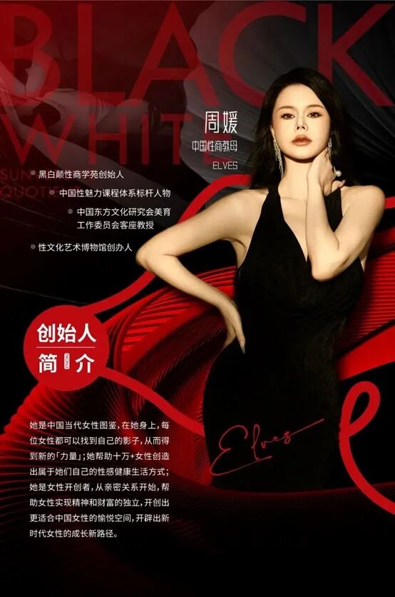 黑白颠性商学苑创始人、中国性魅力课程体系标杆人物、中国东方文化研究会美育工作委员会客座教授、性文化艺术博物馆创办人……