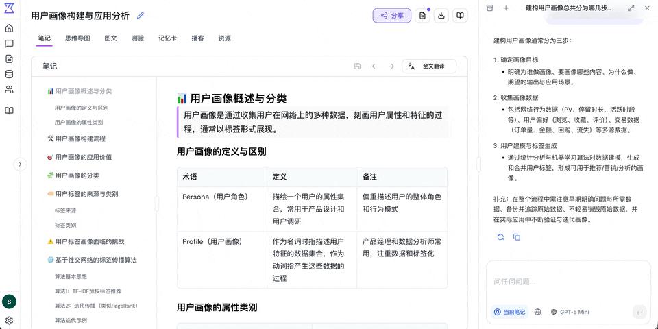 他们发现,即便ChatGPT、Claude、Gemini已经成为学生群体高频使用的AI工具,但面对大量、复杂、多模态的信息源,ChatBot只能做颗粒度较粗的信息归纳,无法快速理解其中最精华的内容,也无法理解各个知识点之间的层级关系。