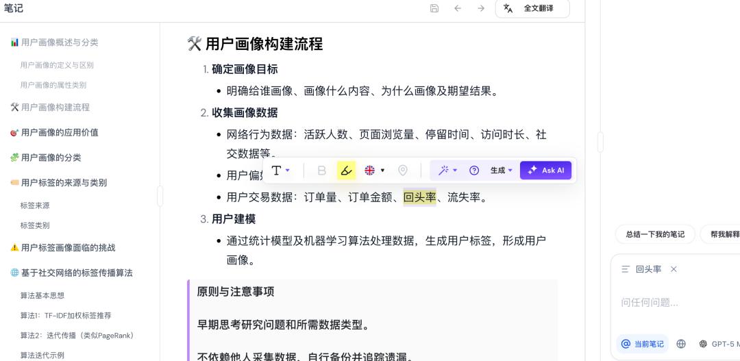 在ThetaWave AI的笔记面板中,除了对文字、图表等内容的基础编辑功能,用户还可以通过选择特定内容,做AI查询、AI润色、AI配图、翻译等个性化编辑和学习。