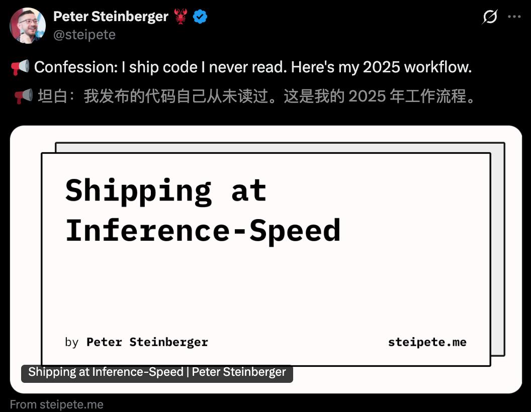 他坦承,「这一年最深刻的变化在于,我几乎不再阅读代码了」。