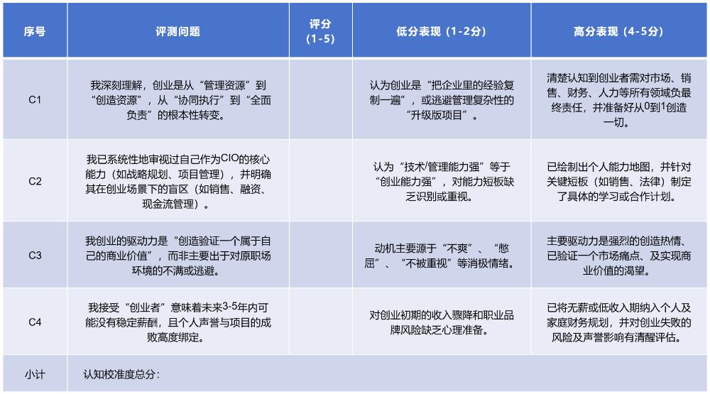 创业不是请客吃饭,需要的是一套系统化的自我评估体系。老杨设计了一套包含“认知校准度、商业转化力、风险耐受值、家庭支持率”四大维度的创业成熟度评测表,结合行为锚点与真实场景题,帮助CIO量化判断自身是否真正具备创业基因。