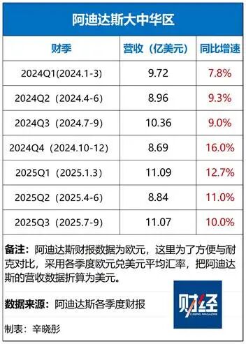 率先在全球和大中华区完成人员更换的阿迪达斯,已经触底反弹,公司2024年扭亏为盈。据2025年三季度财报,阿迪达斯全球营收达66亿欧元,创单季新高,其中大中华区营收9.47亿欧元(约合11.07亿美元),同比增长10%,这是该区域连续十个季度增长、连续四个季度双位数增长。
