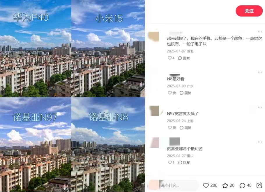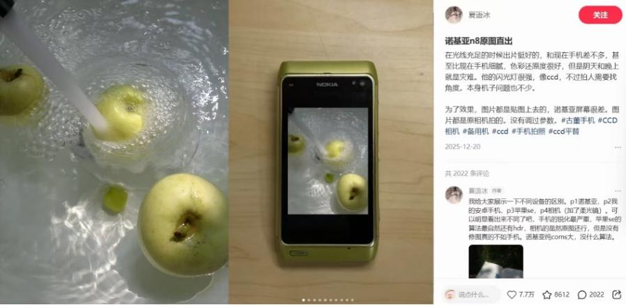 在社交媒体搜索老手机拍照,除了一代神机iPhone XR,服役年限更长的诺基亚N8也常被提及。在社交媒体上,一篇诺基亚N8的测评帖子,得到了7.7万的高赞。用户们在评论区讨论画质,交流淘机体验,俨然形成了一个小众兴趣市集。