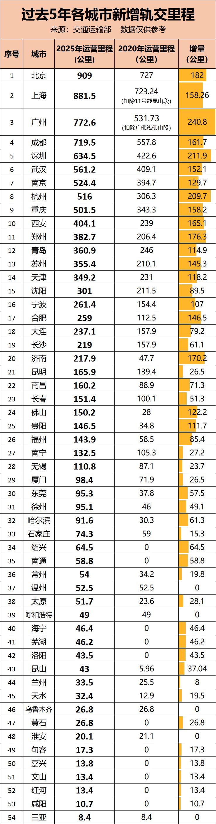 看里程数,北京排名第一,运营里程达909公里;看客运量,上海排名第一,2025全年客运量超过37亿人次;看里程增长,广州排名第一,过去5年净增240公里,跃居中国轨交的“增量之王”。