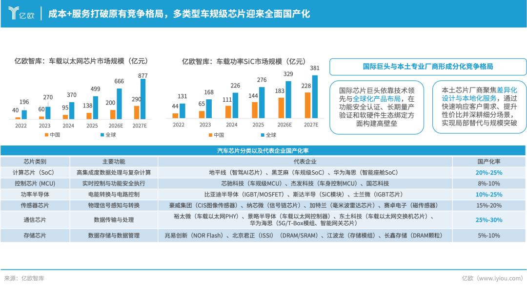 供应链安全、成本优化、本地化服务响应速度提升的技术驱动下,通信芯片(如以太网通信芯片)、功率半导体(SiC/GaN器件)、MCU率先实现国产化大关,AI SoC紧随其后。