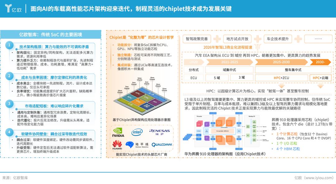 随着2026年L3自动驾驶的逐步落地、车端算力需求进一步放大,Chiplet架构有望从高端车型率先落地,逐步演变为高性能智驾芯片的主流方案,成为支撑智能汽车“超