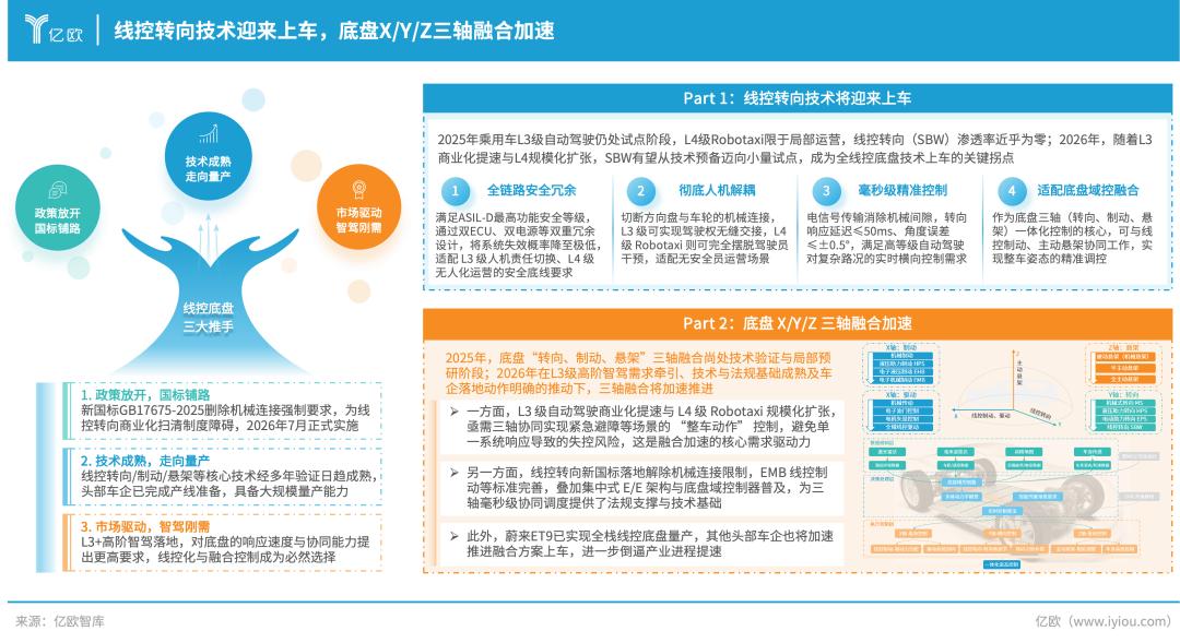 随着L3法规落地、技术成熟度提升、消费者对高阶智驾接受度提高,线控转向(SBW)因其实现全链路安全冗余、人机解耦,为L4预留的硬件接口,正从小规模验证走向量产导入,并成为高阶智驾驾的关键底盘能力,并有望在2026年前后迎来上车拐点。