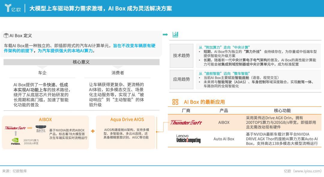 在大模型加速上车、车端算力需求快速膨胀的背景下,AI Box正成为主机厂实现算力弹性扩展的关键过渡方案。