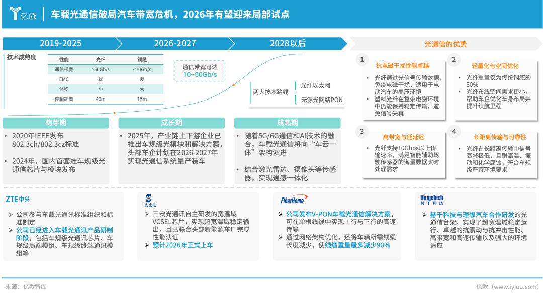 2026–2027年进入局部试点与量产导入窗口,通信带宽可达10–50Gb/s,头部车企开始在特定高端车型或子系统中尝试光通信架构;