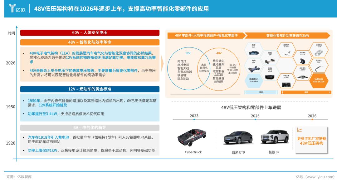 从落地节奏看,48V零部件已率先在特斯拉Cybertruck等车型验证可行性,2025年开始在蔚来ET9、极氪9X等高端车型中规模应用,2026年成为更多旗舰车型导入48V低压架构的关键节点。