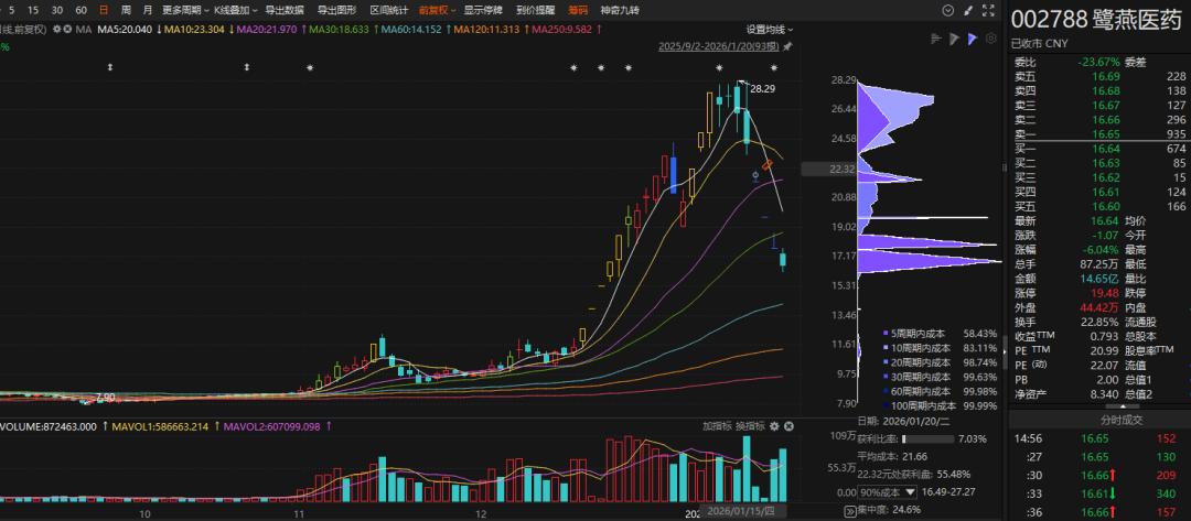去年12月15日,鹭燕医药股价只有11元/股,接着就在一个月内冲高到28.29元/股,然后开始连续下跌,中间有连续三天都是跌停,6个交易日最大跌幅超过40%。