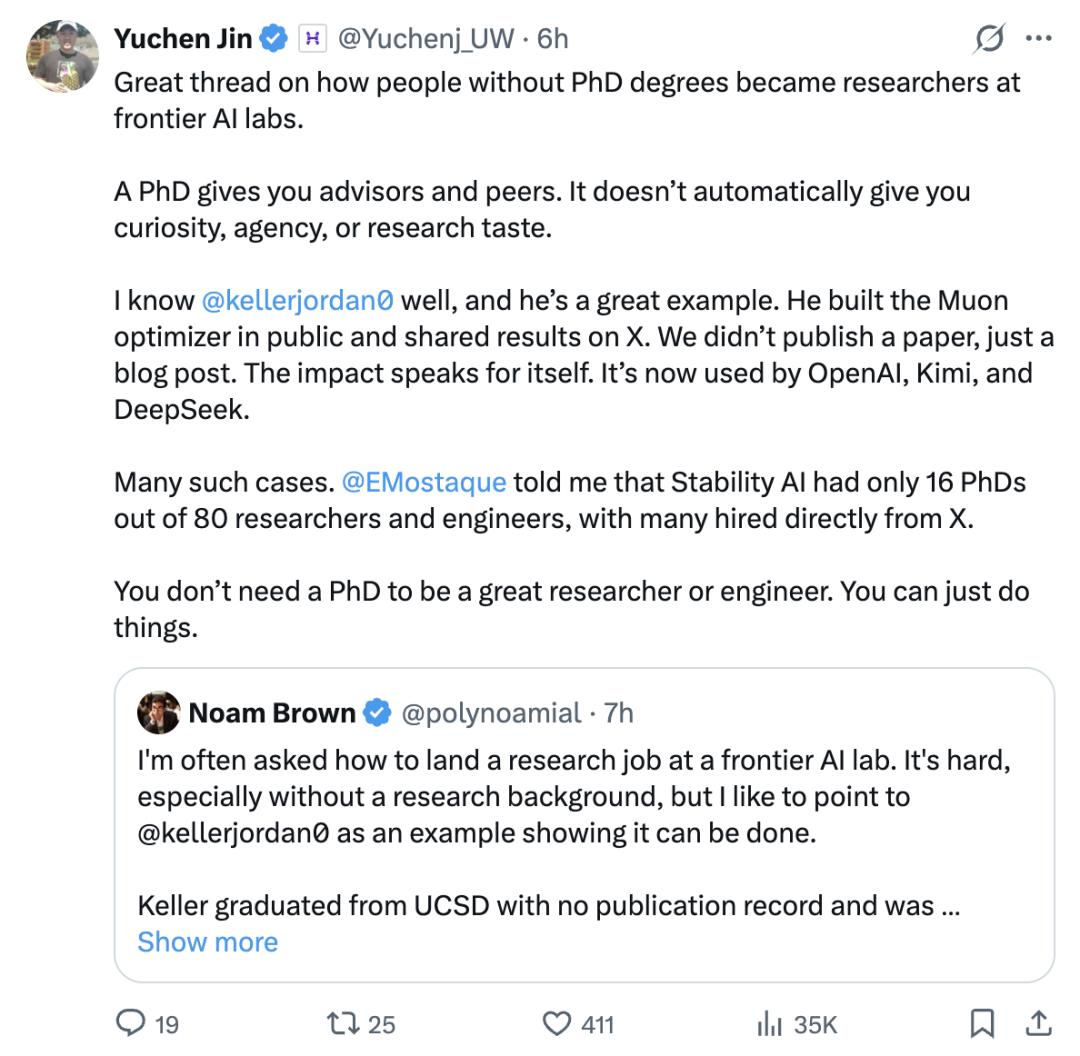 想把研究做好、想进前沿AI大厂,博士学位本身,似乎已经不再是必需品了。