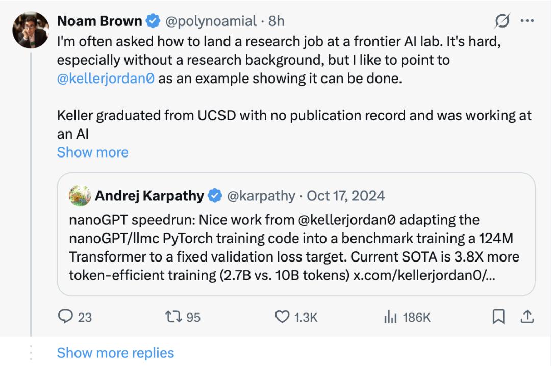 在这篇长帖中,Noam分享了Keller Jordan、Sholto Douglas、Andy Jones、Kevin Wang等一批“非典型”研究员的经历。
