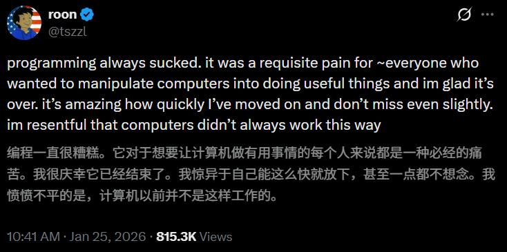 在Roon的评论区,人们开始集体对编程时代说再见。