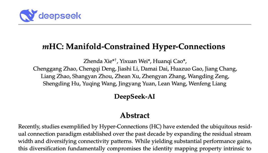 DeepSeek发布了关于mHC(Manifold-Constrained Hyper-Connections) 的论文,扔出了一个重磅炸弹。这篇论文关注的并不是模型参数规模、数据量或算力,而是一个更基础、更底层的问题:大模型中,信息究竟是如何在超深网络里稳定流动的?