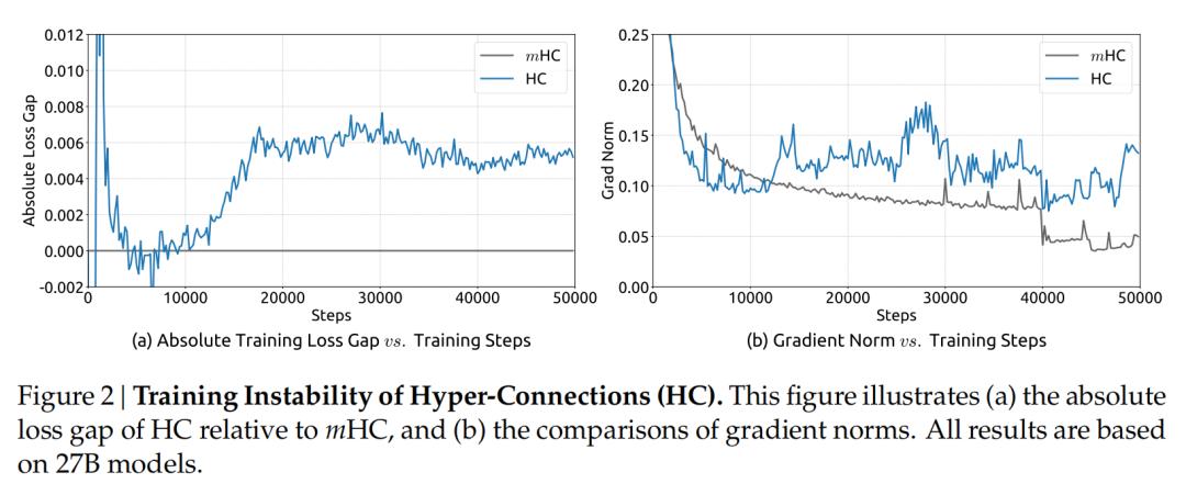 这张图直观暴露了超连接在大模型训练中的致命缺陷:不稳定是结构性的,而非偶发现象。