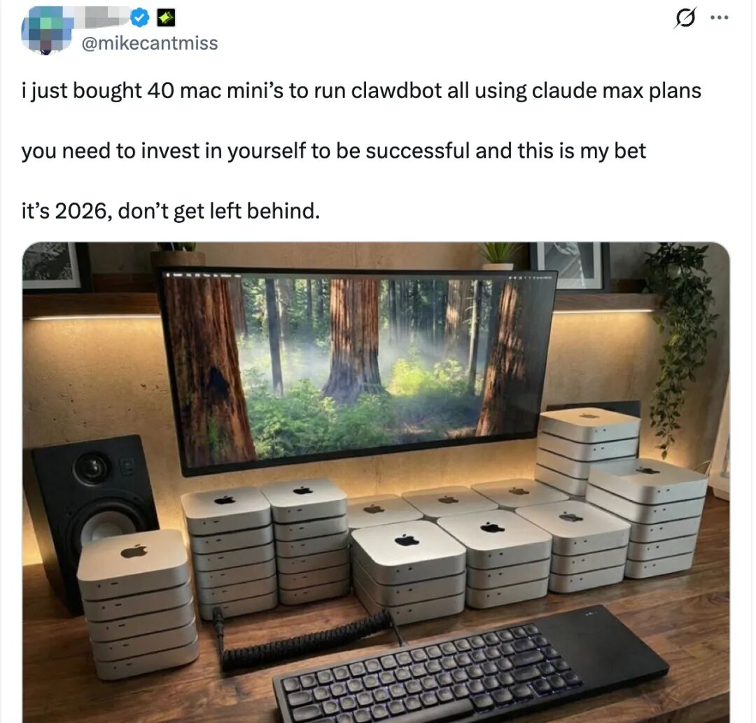 更有网友晒出自己一口气买了 40 台 Mac mini 来运行 Clawdbot。