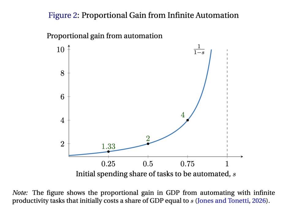 如果说 Acemoglu 的理论是基于静态的观察,那么 Jones 的理论则更好的描绘了系统的结构性阻力。他是一种极限实验,在其中假设把某类任务做到近乎无限便宜/无限供给,问总产出最多能被抬高多少。本质上是一个偏结构约束的视角。