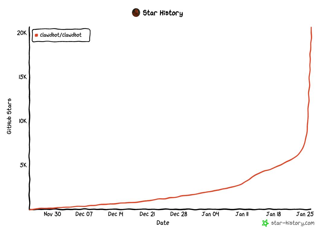 现在又来了个 Clawdbot,号称是一个真正的 AI 个人助手,可以运行在自己的设备上。然后 GitHub 的 Star 数量在这两天, 突然就直线飙升,从五千到两万 ,这在开源项目里面应该算是比较少见的存在。