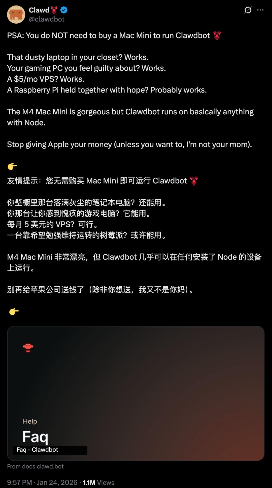 看起来很极客,很赛博朋克,但其实并没有说 Mac mini 是运行这个项目的标配。Clawdbot 官方直接发文说,「别再给苹果公司送钱了,能运行 Node.js 的设备,都可以拿来部署 Clawdbot。」