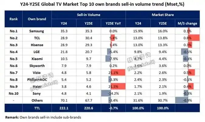 在 2025 年的全球电视出货量排名中,除了三星是韩国企业、Vizio 是美国企业之外,从第二名的 TCL 到第九名的海尔,全部都是中国企业。