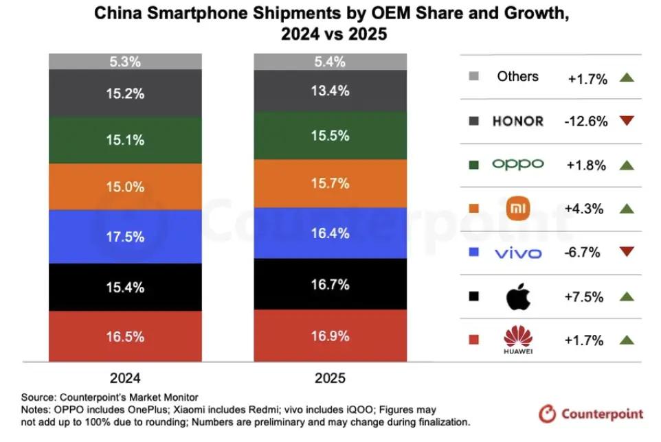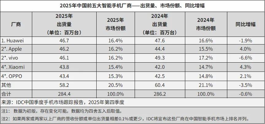2025中国智能手机市场 全年出货 2.84 亿台,同比微降 0.6%。其中华为以 4670 万台出货量与 16.4% 的市场份额在时隔五年之后重夺第一。而从华为中切割出来的荣耀,则跌出前五,出货量被 IDC 合并统计进入了“其他”。