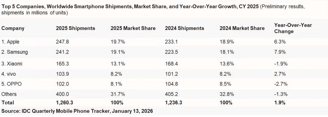按照 IDC 数据,2025 年全球智能手机市场位列前五的分别为苹果、三星、小米、vivo 及 OPPO。前五名共出货超 8 亿,三分天下有其二。