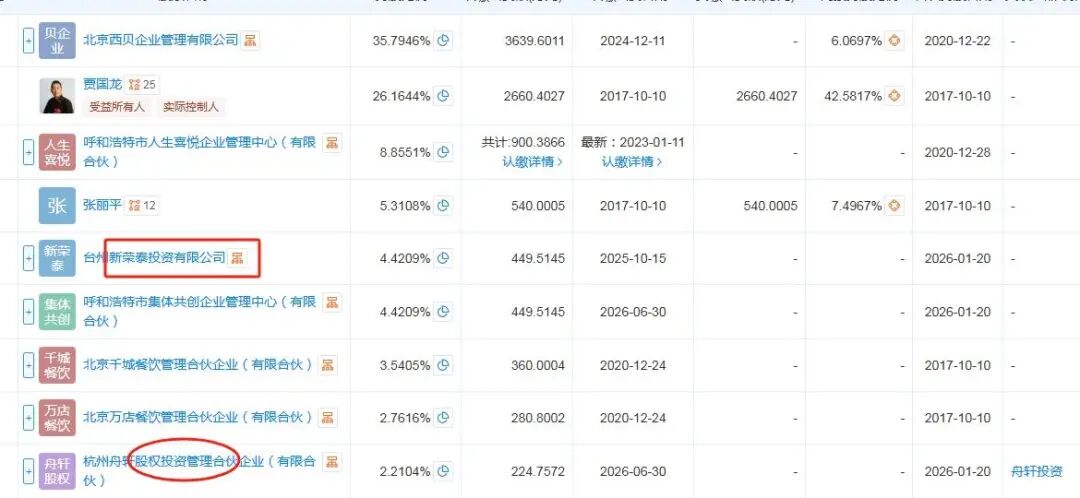 新荣记创始人张勇通过其全资持有的台州新荣泰投资有限公司获得了西贝4.42%的股权;蚂蚁集团前CEO胡晓明则通过杭州舟轩股权投资管理合伙企业持股2.21%。融资后,贾国龙仍持有26.16%的股份,保持实际控制人地位。