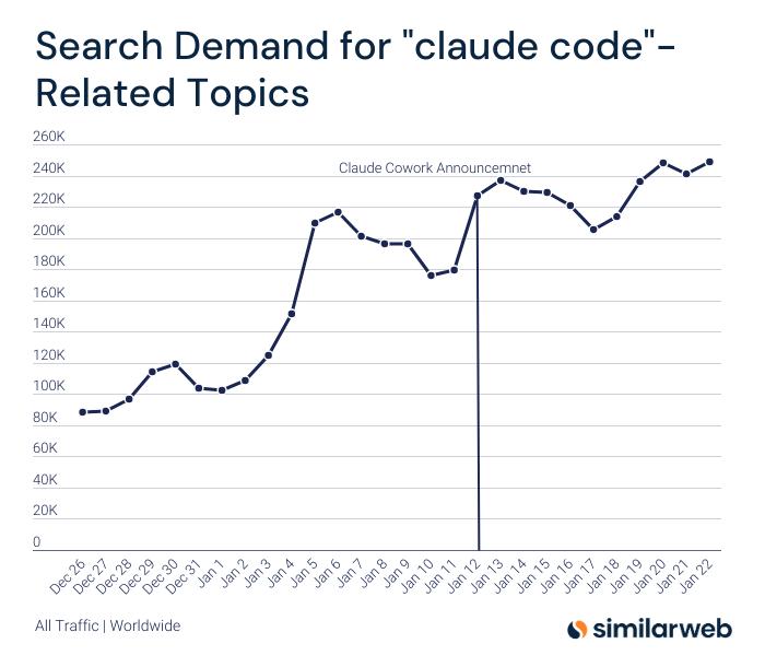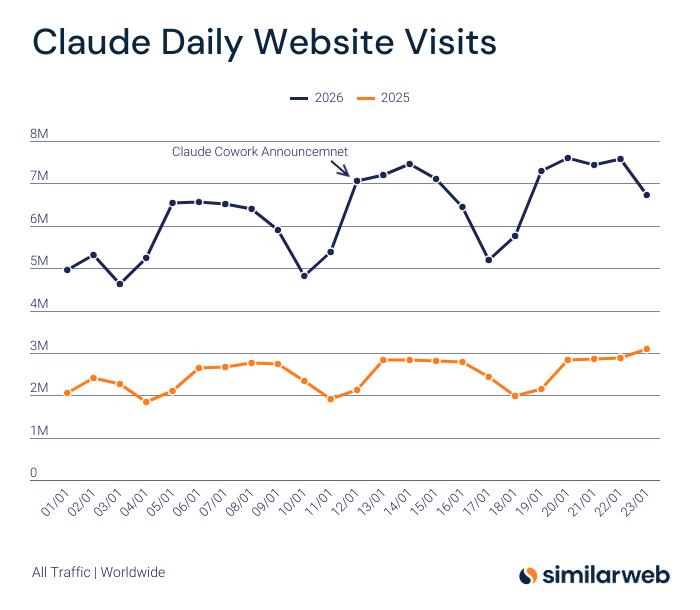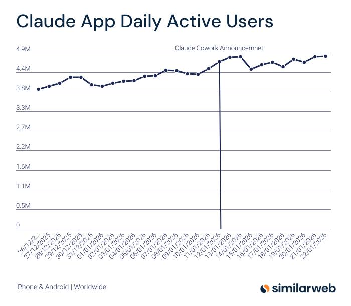 Anthropic的Claude Cowork功能推出后,根据Similarweb的数据,相关指标呈现爆发式增长——