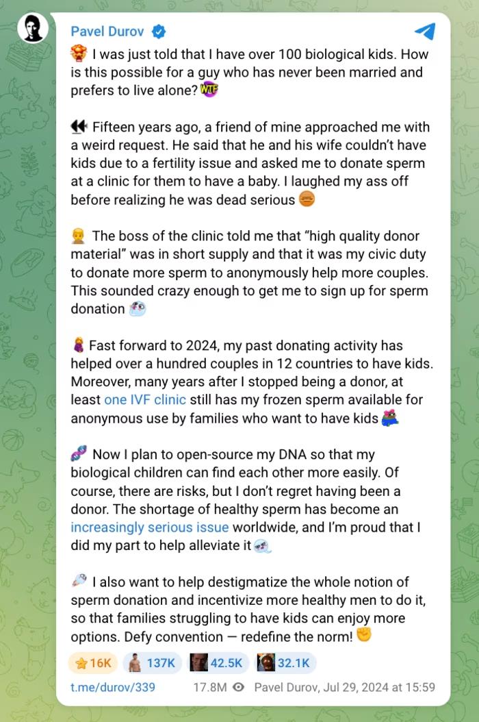 他在2024年7月的Telegram帖子中写道,自己大约从2010年开始捐精,起初是帮助一位朋友,后来匿名进行,以缓解“高质量捐赠材料”的短缺。