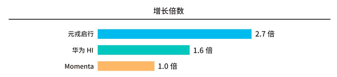 从增长倍数来看,元戎启行、Momenta和华为Hi分别为2.7倍、1.0倍和1.6倍,元戎启行的增势最为显著。