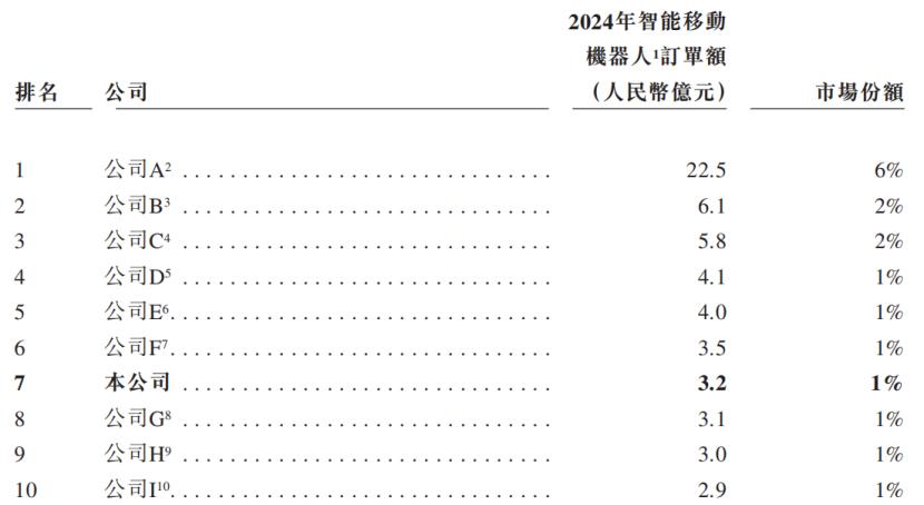 2024年全球智能移动机器人行业中十大厂商的资料(按订单额计),来源:招股书