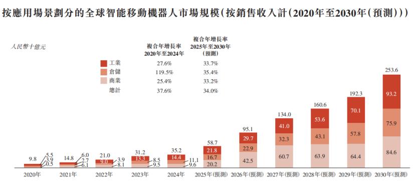 根据灼识咨询的资料,按销售收入计,全球智能移动机器人市场规模由2020年的98亿元增至2024年的352亿元,复合年增长率为37.6%,预期到2030年将达2536亿元。