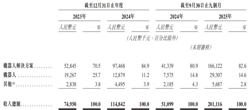 2025年1-9月,公司来自销售机器人解决方案的收入占比约82.6%,较2023年的70.5%有所提升。