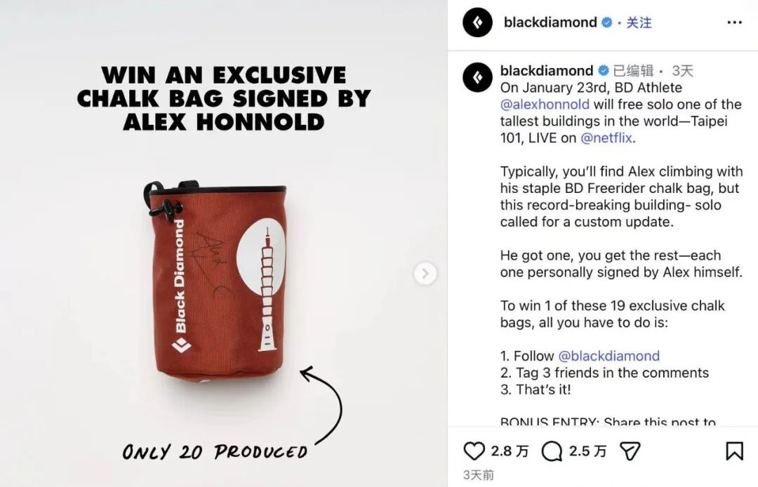而腰间佩戴的则是美国户外品牌Black Diamond为这次攀登特别定制的粉袋,上面印有台北101的图案。