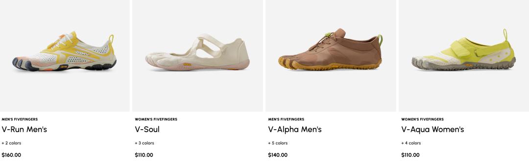 以赤足鞋的先驱品牌Vibram五指鞋为例。品牌初创时就打出「赤脚是为了健康而不是为了美观」的口号,鞋款外形完全模拟人的双脚,五指独立分开,以达到穿着时脚趾完全舒展的效果。