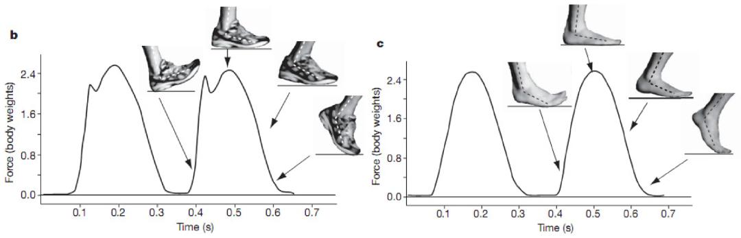 人在赤脚跑步时会先前脚掌着地,或中脚掌着地,较少情况下会后脚跟着地。跑动过程中,强壮的跟腱、小腿、足弓会吸收来自地面的大部分冲击力,并将其储存为弹性能量均匀释放到下一步中。图源[1]