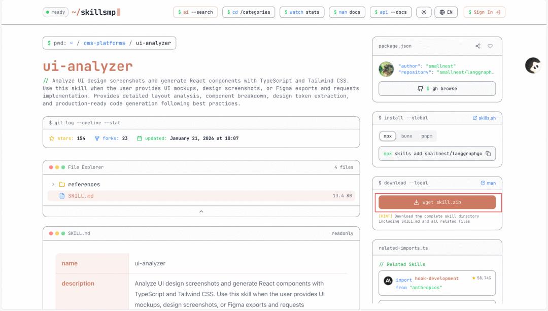 先前往 Claude Skill (skillsmp.com),下载对应的 Skill 文件包后在本地解压: