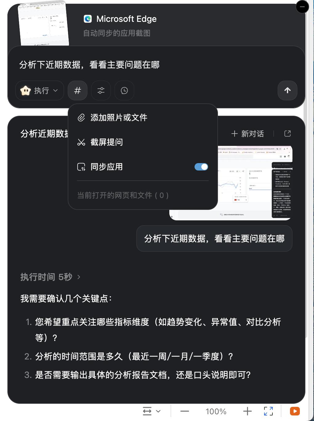 打开“同步应用”的开关后,我在浏览器里打开google analytics,然后通过快捷键唤起它,当前正在查看的页面便自动作为上下文信息同步进去,然后就可以直接让它来进行分析: