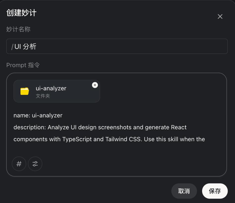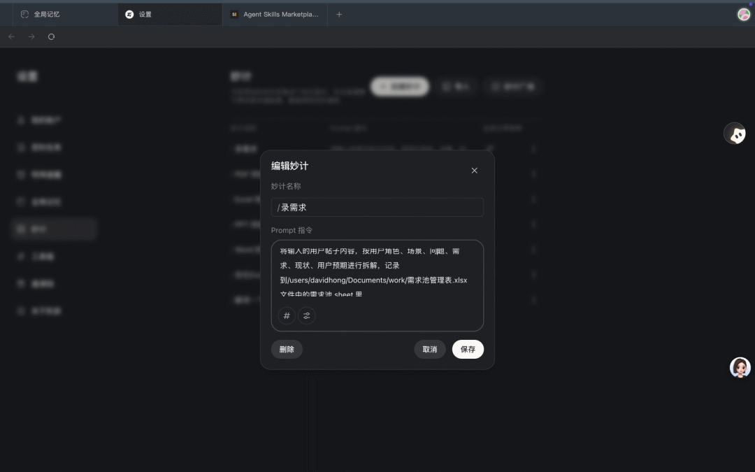这个环节,是我最早开始使用「妙计」功能的地方,它的能力类似 Claud 的 Skill,除了系统预设的妙计Skill 外,还支持自定义 妙计 Skill。