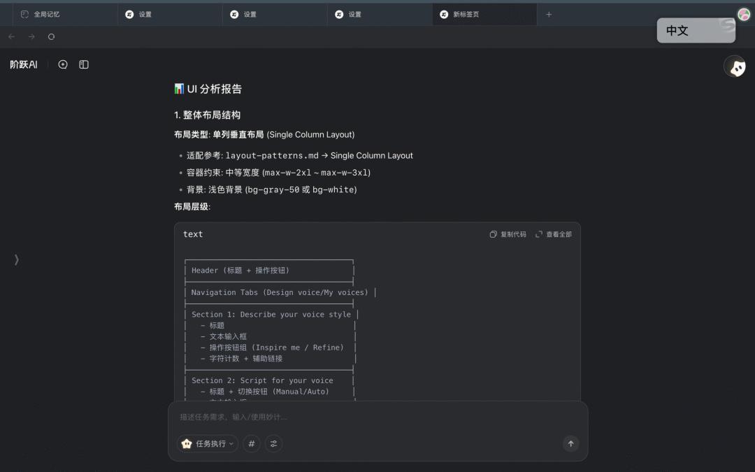 它的使用方式很简单:只需要提供一张产品 UI 截图,就能对整个界面进行系统性的分析,包括布局结构、信息层级、视觉规范,甚至还能进一步生成可运行的代码 demo,用于快速验证设计思路。