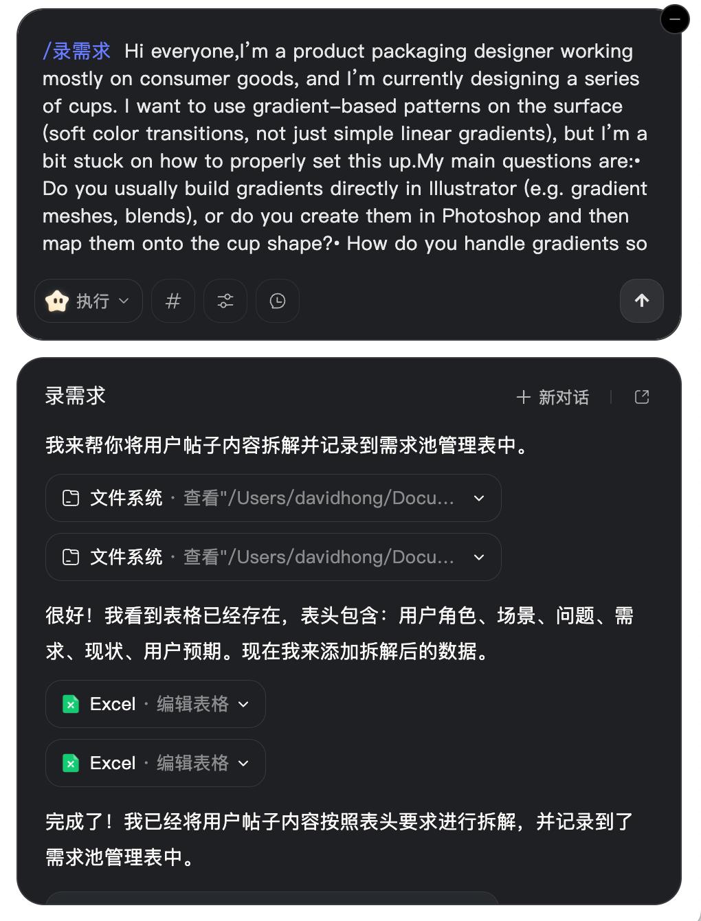 妙计使用起来也非常方便,在唤起AI助手后,通过输入“/”就可以选到这个录需求的Skill,然后再把用户需求相关的帖子内容提供给它,它便会按照 skill 定义好的需求录入规范,先对需求进行信息提取,然后自动写入到我电脑本地的需求池管理表中: