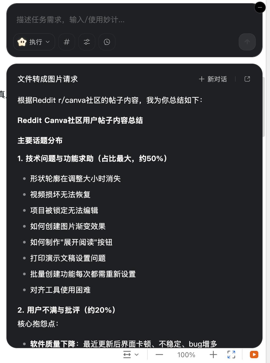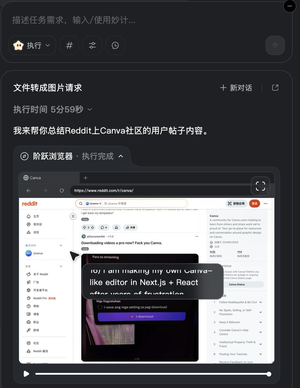 打开页面后,它会自动理解当下的任务目标,然后自动识别网页的内容结构,跟真人一样滚动查看网页,最终总结输出帖子内容的总结: