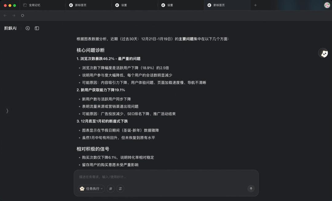 做完产品设计,需求开发上线后,我们还得观察上线后的数据效果,过往也是需要人工来洞察数据的变化,在这个场景下,我也尝试用阶跃AI 助手来帮我。