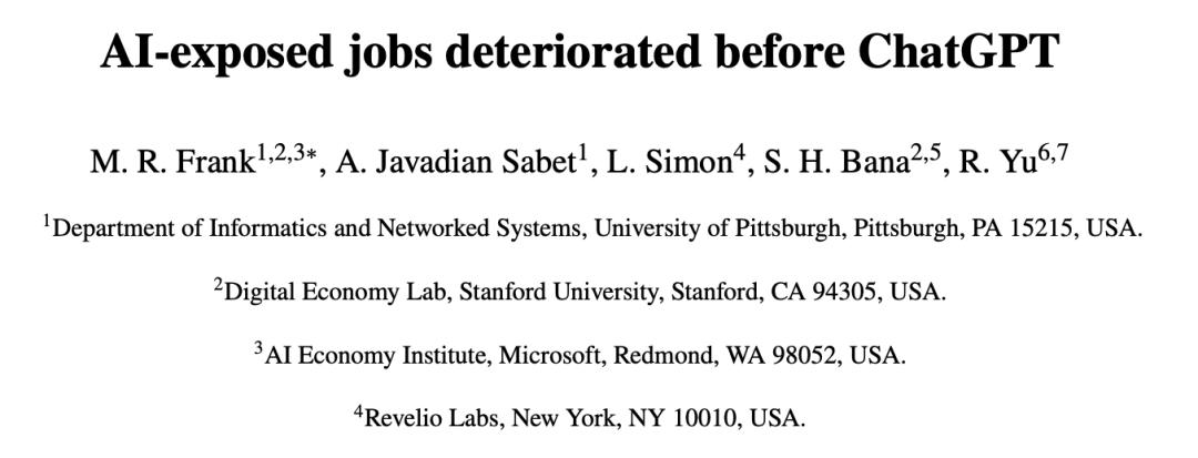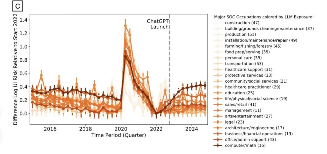 计算机、商务、金融等高AI暴露率的职业,其失业风险在2022上半年已远超餐饮与建筑业。