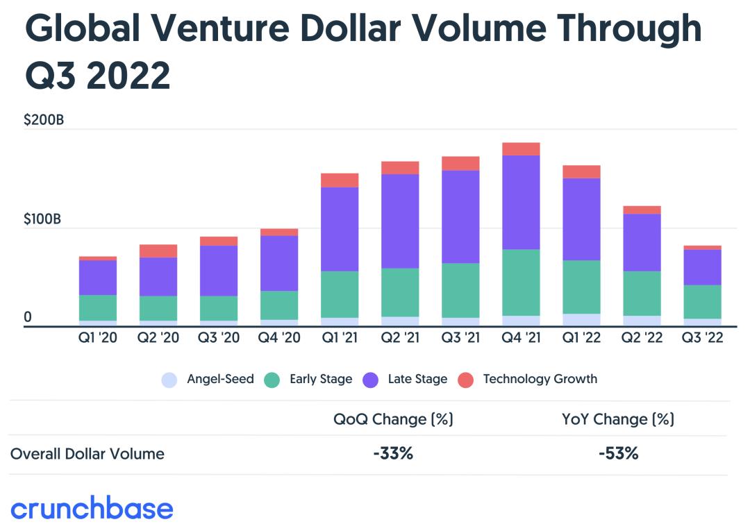 根据Crunchbase的统计数据,2022年第三季度的全球风投融资额仅为810亿美元,同比暴跌53%。