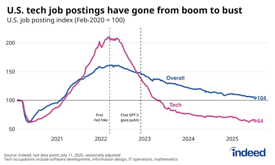 科技职位信息在 2022 年初之前后翻了一倍以上,但此后已全部回撤,截至 2025 年 7 月 11 日,较疫情前水平低 36%。